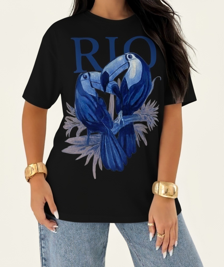 Confeccionada em algodão , a T-shirt “RIO” traz estampa exclusiva de tucanos em tons de azul, que remetem à natureza e à energia vibrante do Brasil.