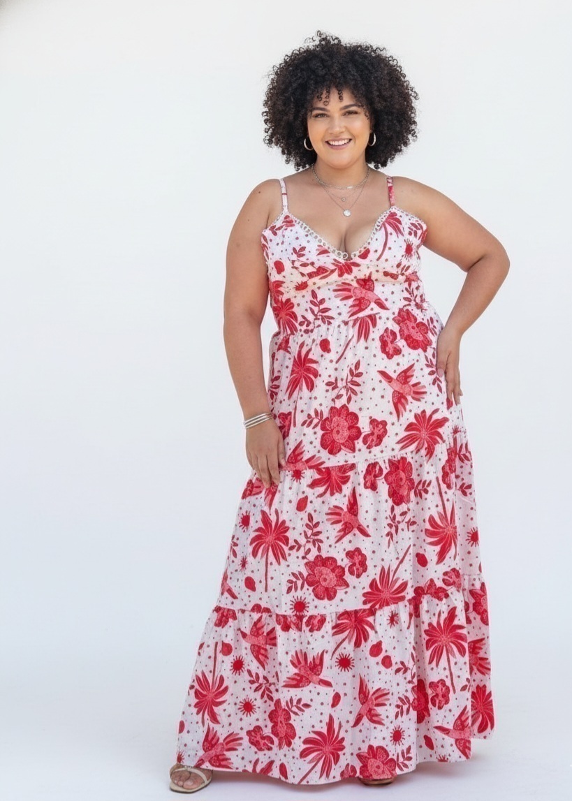 Esse vestido longo é perfeito para quem busca leveza, conforto e um toque tropical no visual. Feito em tecido fresco e com modelagem soltinha, ele oferece movimento e caimento impecável. O decote em “V” com alcinhas ajustáveis garante ainda mais conforto, enquanto a saia em camadas deixa o look feminino e elegante.